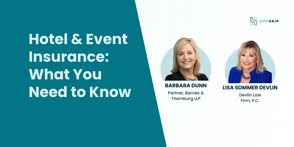 In this video, Sean Whalin (Co-founder and CEO of HopSkip) sits down with Barbara Dunn (Partner at Barnes & Thornburg LLP representing groups) and Lisa Sommer Devlin (Devlin Law Firm, P.C. representing hotels) to discuss what you need to know about hotel & event insurance.